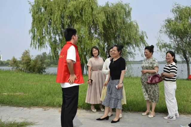 首先,实践团抵达了风景如画的曹县八里湾农村风景区,受到了热情洋溢的负责人亲切接待。在负责人的详细解说中,实践团成员们逐渐揭开了这片土地的神秘面纱。实践团成员们在负责人的引导下,参观了景区内的各项设施:蜿蜒的木栈道穿行于湿地之间,为游客提供了亲近自然的步行路径;观景台上,游客可以俯瞰整个景区,将八里湾的山水风光尽收眼底;而生态农园里,实践团成员们亲自体验了采摘新鲜蔬果的乐趣,感受到了农业旅游的魅力。