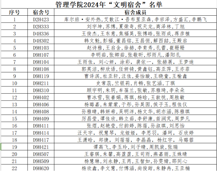 根据《太阳成集团tyc122cc入口2024年宿舍文化节活动方案》等有关文件要求,本着公平、公正、公开原则,经各宿舍申报、学院审核,现对2024年管理学院“文明宿舍”名单进行公示,如有异议可通过以下途径反映,截止到11月17日12:00之前。