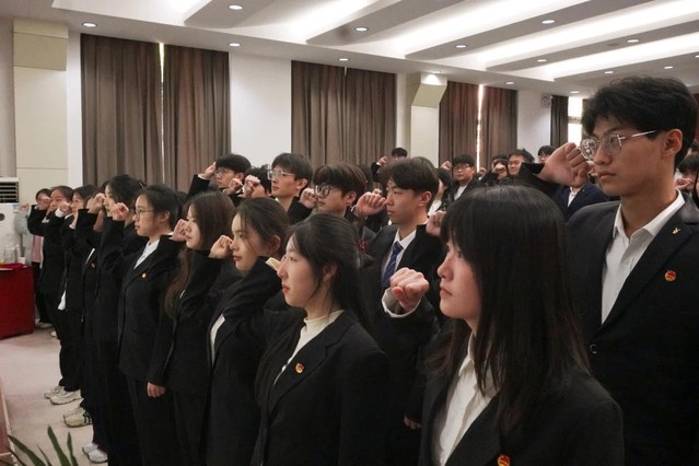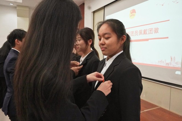 2024年下半年新发展团员入团仪式环节,靳祺宣读新发展团员名单,本次共有20名青年经过层层考验与选拔,光荣地加入了中国共产主义青年团。各班团支书为新团员佩戴团徽,团员代表黄一超带领新发展团员面向团旗庄严宣誓,用坚定的誓言表达了成为一名共青团员的责任和决心。