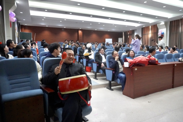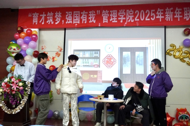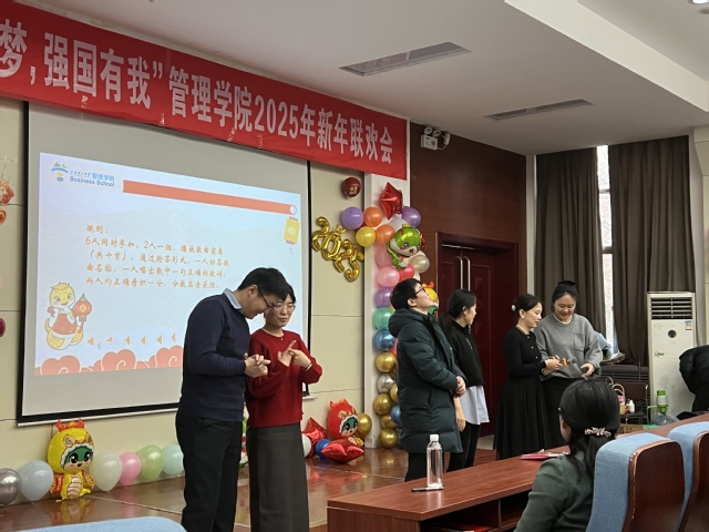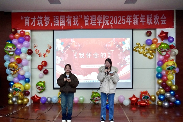 高群等4人带来的朗诵《蛇年灵蛇追梦想未来可期放光芒》,用深情的语言描绘新年的喜庆与希望,传递满满力量与期待。外籍教师爱马德演唱中文经典歌曲《月亮代表我的心》,跨文化交流的温暖引发全场掌声与欢呼,联欢会的一大亮点。师生同乐,学生也为教职工联欢会献上精彩节目。曹文彬等5人表演的小品《面子》幽默风趣,传递生活哲理,赢得满堂喝彩。本科生代表陈祎昕与宫奕辰对唱《我怀念的》,歌声动人,余音绕梁。研究生张筱迪等2人朗诵《新的一年新的期盼》,深情有力,表达对未来的憧憬与热忱。