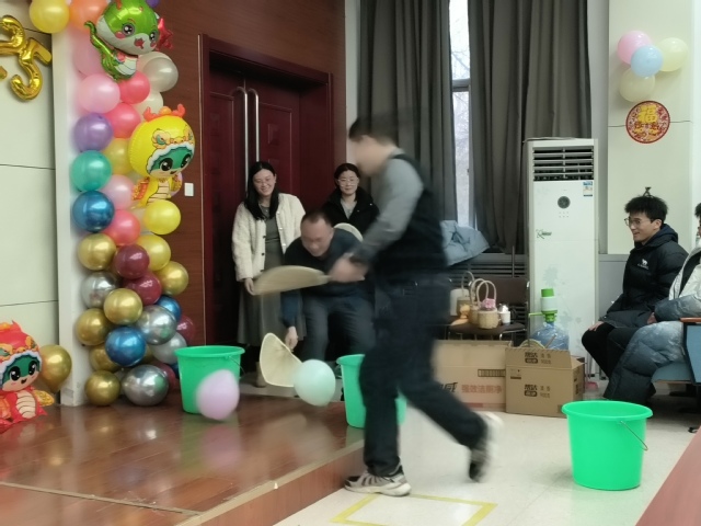 首轮游戏“蛇舞乒乓”活力开启,老师们绑着球盒尽情扭动,一场别开生面的身体律动之战打响。接着,“蛇趣踏步”“听歌识曲”将现场气氛推向高潮。“赶蛇进洞”中,参与老师全神贯注地扇动气球,紧张得如同拉满弦的弓箭,一触即发。“你画我猜”“谁是卧底”等游戏亦备受喜爱,老师们热情高涨,尽情享受游戏之乐与同事情谊,沉浸在欢乐海洋。