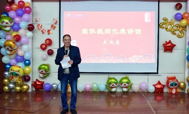 史成东作为荣休教师代表讲话。他感谢同事们的关心与关爱,畅谈了努力做好角色转换工作以及用积极的工作态度面对不同岗位等感悟。他表示,将永远热爱学校,关心学校发展,一如既往支持学校和学院工作。