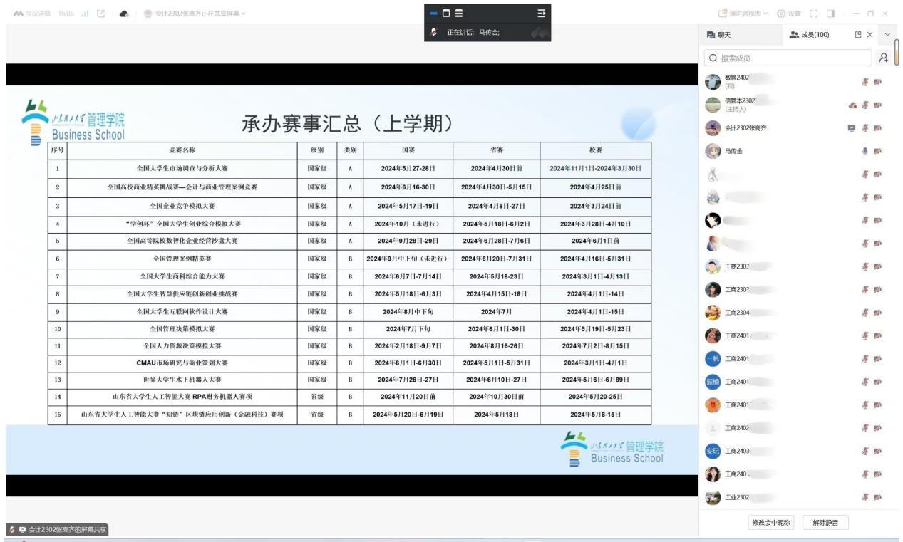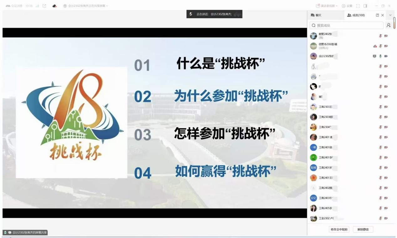 为浓厚学院创新创业氛围,激发学生创新潜能,增强学生参与科创竞赛的能力,提升学院“挑战杯”系列竞赛作品质量,培育更多优秀项目成果。2月17日下午,我院举办2025年寒假“挑战杯”系列赛事线上专题培训会,辅导员马传金主讲,学生会科创部工作人员、各班学生代表以及“挑战杯”竞赛参赛团队学生负责人参加。