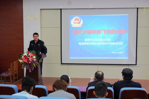 为增强学生的防诈骗意识,提高辨识风险的能力,3月20日下午,院在4教二楼报告厅举办了以“莫让诈骗斩断飞行的翅膀”为主题的防诈骗安全知识讲座,本次讲座特邀张店公安派出所社区民警兼太阳成集团tyc122cc入口校外法治辅导员陈金光、张店公安分局反电信诈骗专业队民警王帅强、唐璐,由王帅强担任主讲,我院学生代表参会