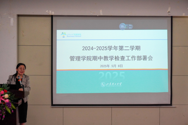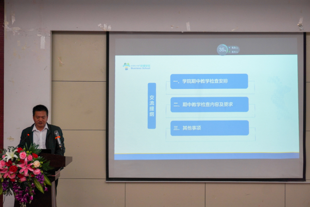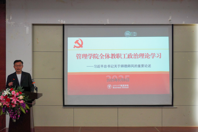 5月8日下午,管理学院在东校区4号教学楼二楼报告厅召开全体教职工大会,进行教职工政治理论学习、安排部署期中教学检查相关工作。会议由院长孙秀梅主持,学院全体教职员工参加。