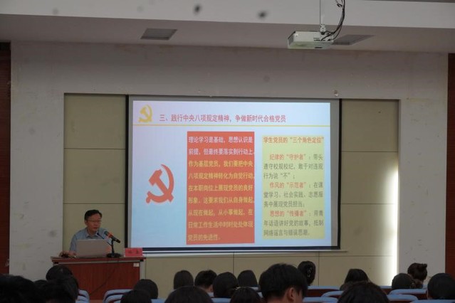 杨直围绕学习教育主题,从“深刻认识开展深入贯彻中央八项规定精神学习教育的重大意义”“全面理解中央八项规定精神的核心要义”“践行中央八项规定精神,争做新时代合格党员”三个方面给全体学生党员上了一堂深刻而又生动的专题党课。