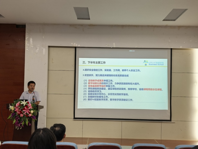 副院长胡付领总结了上半年教学工作完成情况,就开学前后的准备及注意事项、下半年的主要工作及关键任务做了部署安排,他强调老师们要重视课堂管理,狠抓课堂纪律,不断提升课堂教学质量,确保教学秩序稳定不触碰底线。