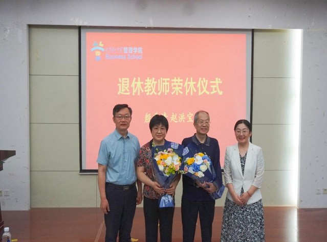 颁奖结束后,举行退休教师荣休仪式。张佳向大家介绍两位荣休教师殷秀清、赵洪宝的从教经历与卓越贡献,学院青年教师代表上台献花,杨直、孙秀梅与其合影留念。